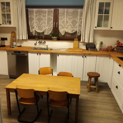 Hier bereiten wir – auch oft gemeinsam mit den Kindern – die Mahlzeiten zu und lassen es uns zusammen am großen Tisch schmecken.