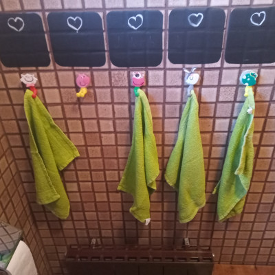 Wir haben einen Wickeltisch, ein Waschbecken und eine angepasste Toilette sowie ein "Töpfchen"